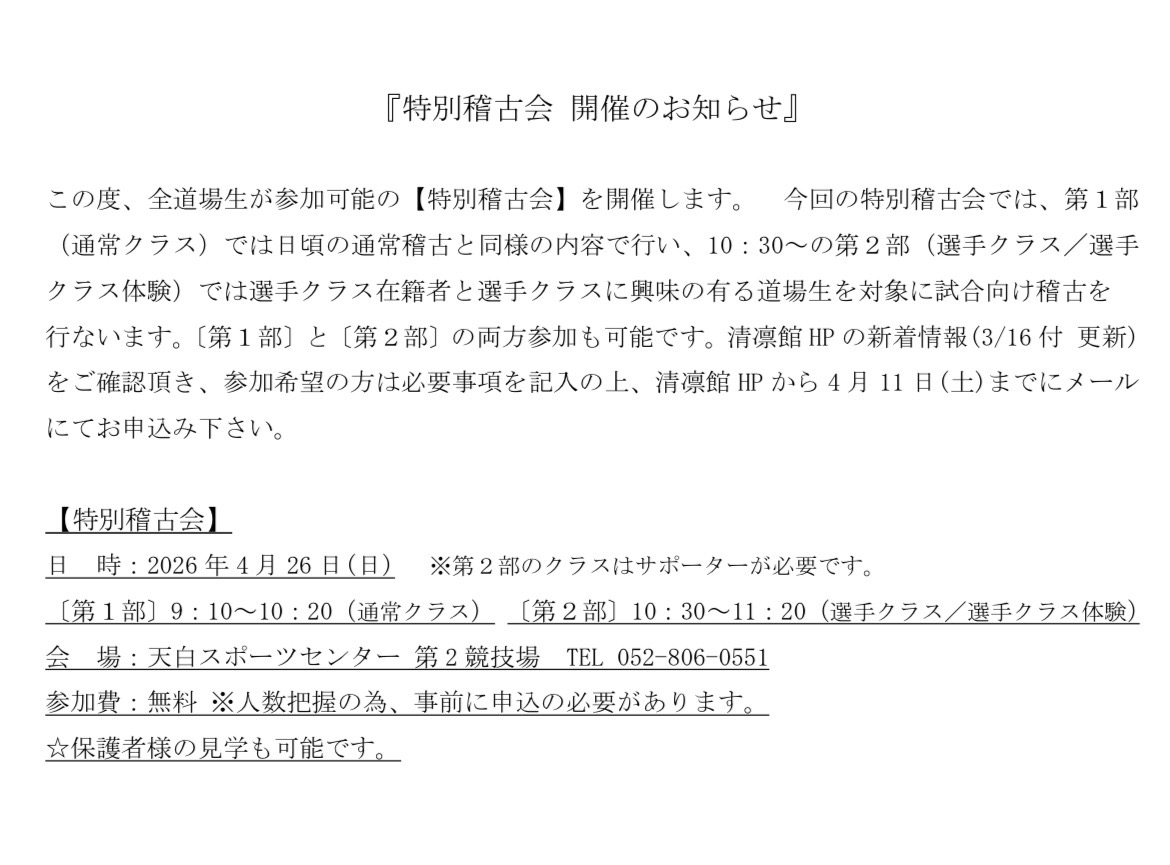 この度、全道場生が参加可能の【特別稽古会】を開催します。